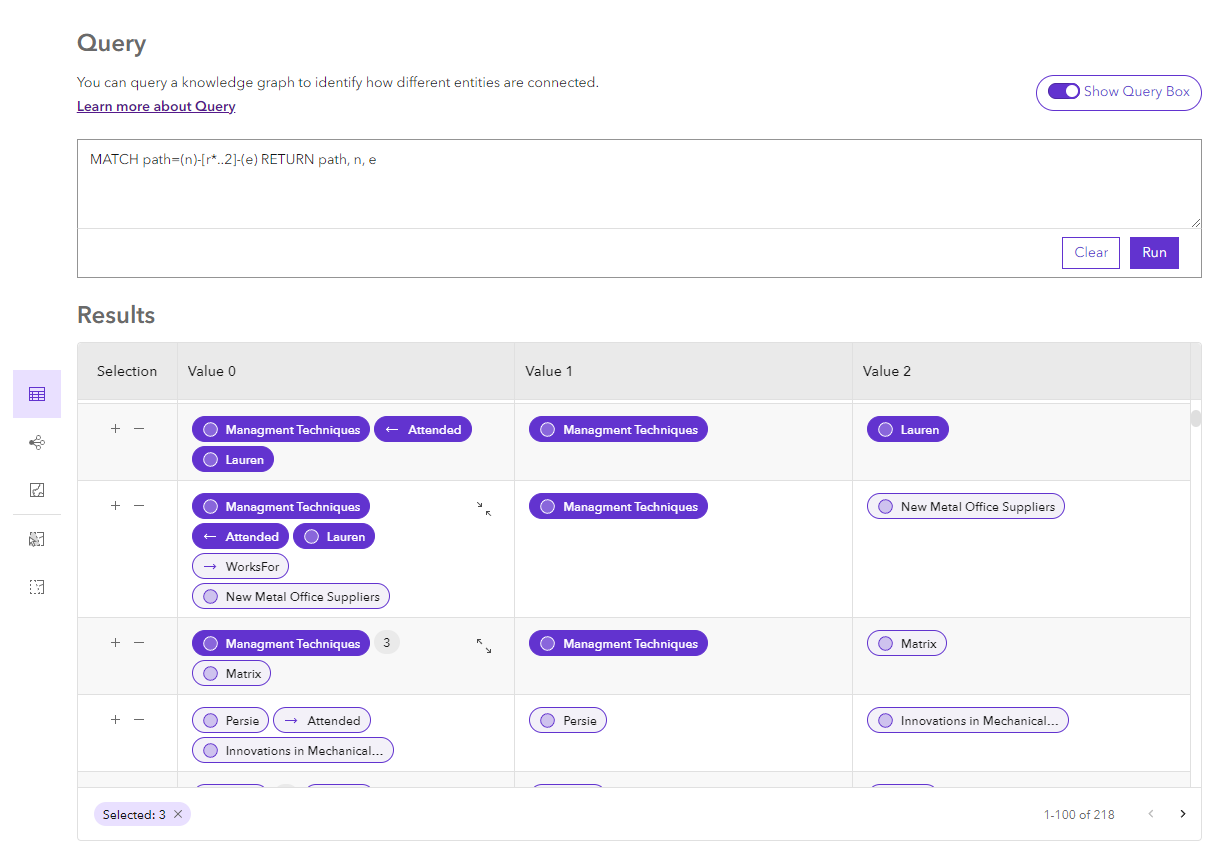 in the Selection column to add all of the entities and relationships in that row to your selection.The entities and relationships in this row will be highlighted. Any instances of those entities and relationships that appear in other result rows will also be highlighted. The total number of selected records is displayed at the bottom of the table.